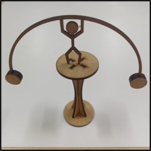 Um pequeno boneco é posto em cima de uma base; o mesmo tem uma vara curva cujas extremidades têm pequenos pesos, baixando seu centro de gravidade. Nota-se que, ao movimentar o boneco devido à simetria do seu centro de massa, ele tende a retornar ao equilíbrio.